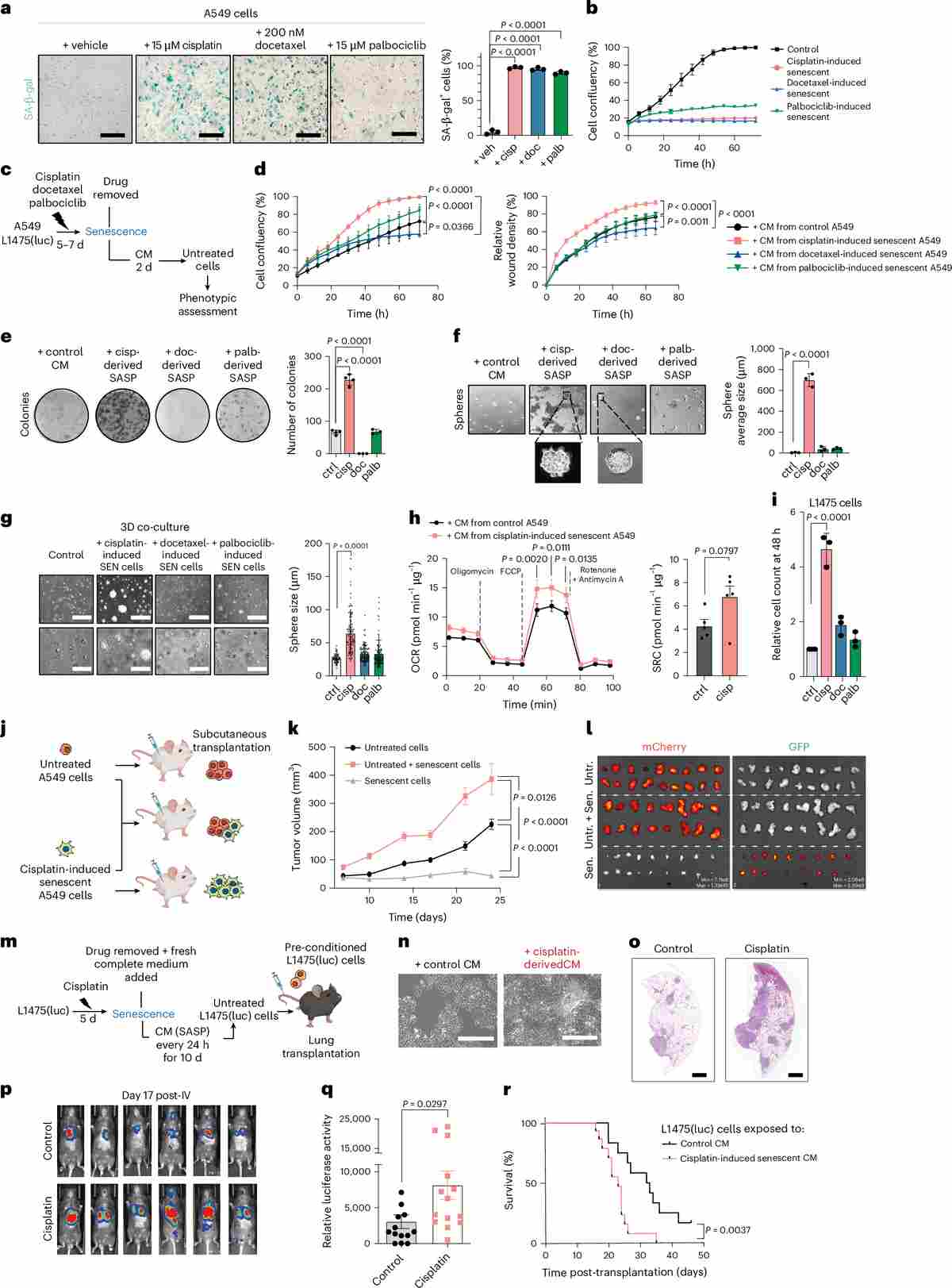 Figure 1. Cisplatin-induced senescent A549 and L1475(luc) cells and their secretomes promote increased tumor growth in xenograft and orthotopic models of NSCLC. (a–b) SA-β-gal staining and confluence curves confirm senescence induction. (c–h) Conditioned medium from senescent A549 cells enhances proliferation, migration, colony formation, spheroid growth, and metabolic capacity in non-senescent counterparts. (i–r) In vivo xenograft and orthotopic lung colonization models demonstrate significantly elevated tumor burden and shortened survival in mice receiving senescent-cell-conditioned A549-luc cells.