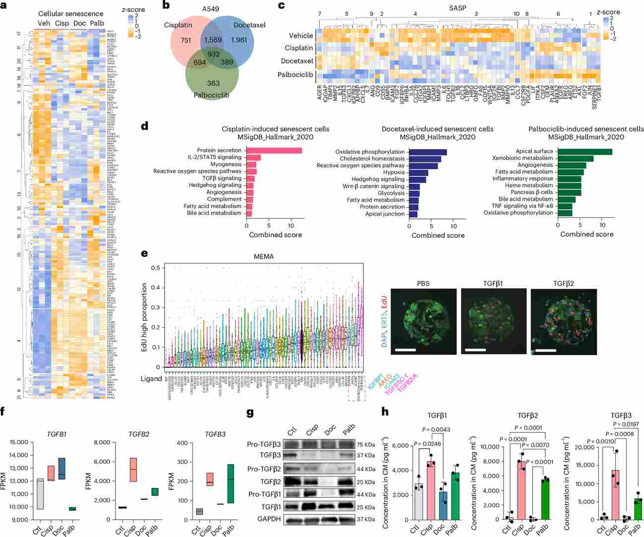 Figure 2. Transcriptomic and proteomics analyses reveal different transcriptional and SASP signatures of chemotherapy-induced senescent cells and highlight TGFβ ligands as potential candidate drivers of malignant traits in cisplatin-derived SASP. (a) Heatmap of senescence-pathway gene z-scores. (b) Venn diagram of upregulated genes across three senescence inducers. (c–d) SASP gene expression heatmap and MSigDB Hallmark pathway enrichment. (e) MEMA screen identifying TGFβ1/β2 as top proliferation-promoting ligands. (f–h) FPKM, Western blot, and ELISA data confirming elevated TGFβ in cisplatin-derived SASP.