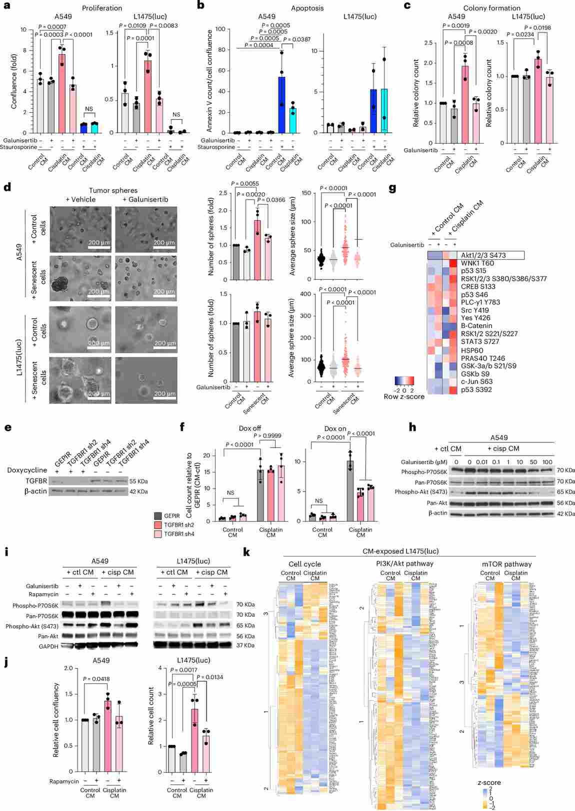 Figure 3. TGFBR1-driven activation of AKT/mTOR pathway orchestrates the induction of malignant traits upon exposure to cisplatin-derived SASP. (a–d) Galunisertib reverses SASP-driven proliferation, apoptosis resistance, colony formation, and spheroid growth in A549 and L1475(luc) cells. (e–f) TGFBR1 shRNA knockdown abrogates SASP-induced proliferation. (g–k) Phospho-kinase array, Western blot, and transcriptomic analyses identify AKT/mTOR as the key downstream effector pathway.