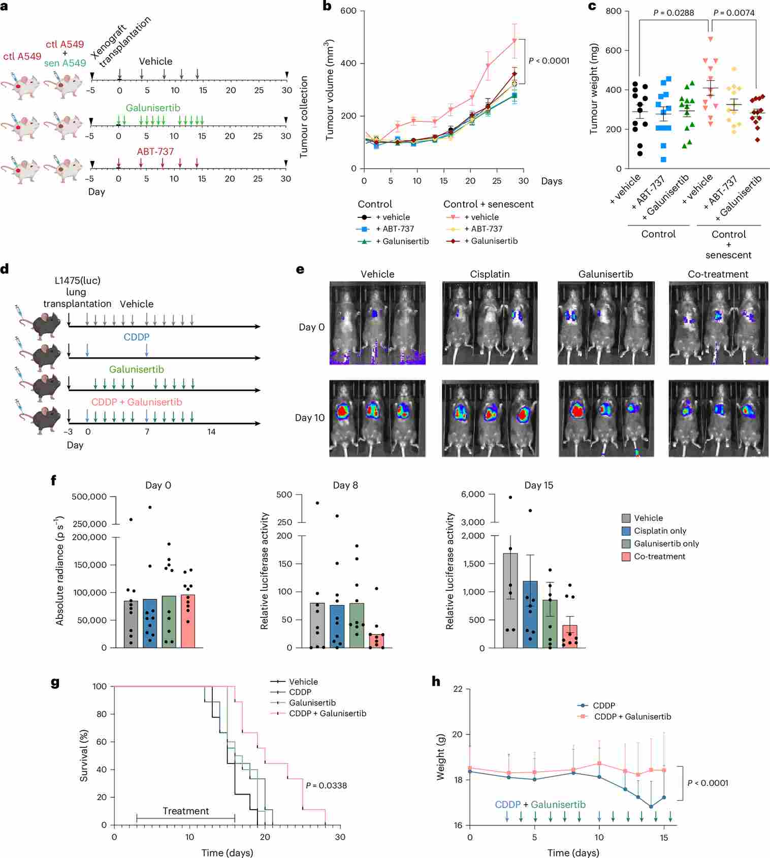 Figure 4. TGFBR1 inhibition effectively prevents enhanced proliferation derived from the exposure of cisplatin-induced senescent SASP in xenograft and orthotopic models of lung adenocarcinoma. (a) Experimental design schematic. (b–c) Tumor volume and weight over time showing galunisertib-mediated reduction. (d) Orthotopic model layout with tail-vein injection of L1475(luc) cells. (e–f) Representative bioluminescence images and quantification of luciferase activity at days 2 and 10. (g–h) Kaplan–Meier survival curves and body weight changes across treatment groups.