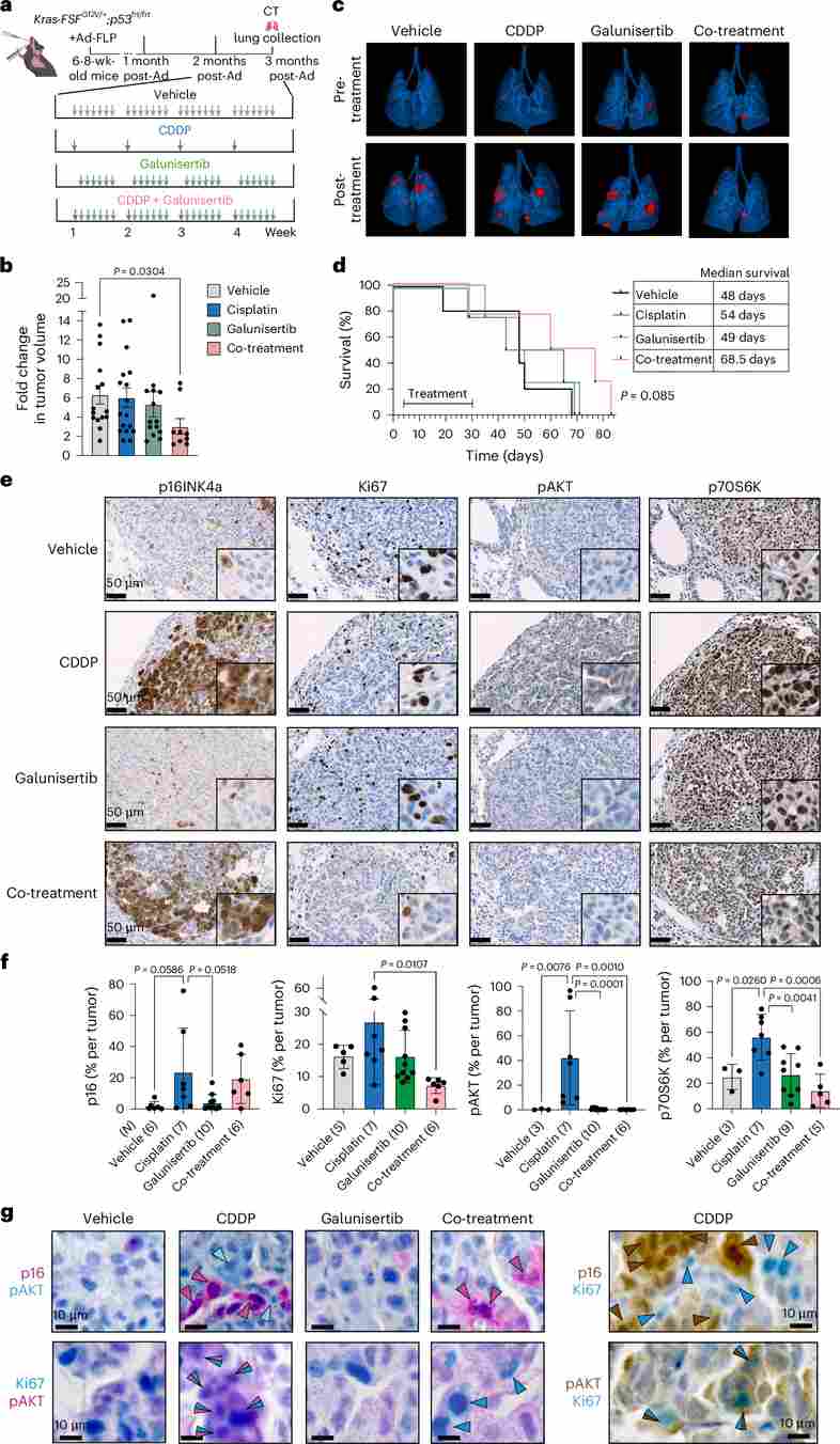 Figure 5. Cisplatin and galunisertib concomitant treatment significantly reduces tumor burden and enhances survival in a KrasG12V-oncogene-driven model of lung cancer. (a) Experimental layout schematic for KrasG12V/+;p53frt/frt GEMM. (b) CT-measured tumor volume fold-change after treatment. (c) 3D lung CT reconstructions before and after treatment (tumors in red). (d) Kaplan–Meier survival curves. (e–f) Representative IHC images and quantification of p16, Ki67, pAKT, and p70S6K. (g) Dual IHC co-staining showing spatial correlation between p16+ senescent cells and pAKT+ proliferating neighbors.