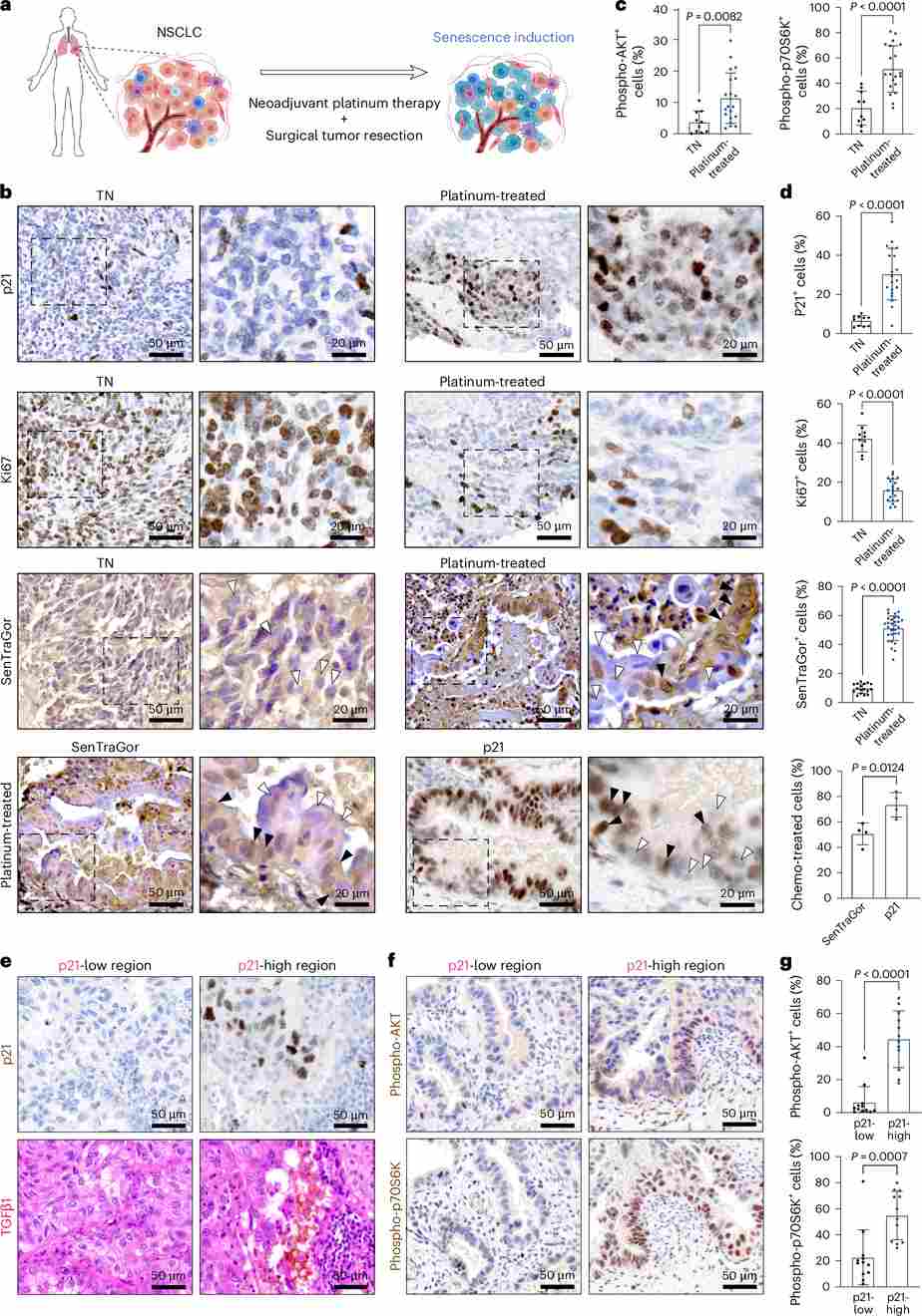 Figure 6. Neoadjuvant platinum-based therapy induces senescence in patients with NSCLC, and this correlates with increased phospho-AKT and phospho-P70S6K signaling in surrounding cells. (a) Study schematic for human NSCLC samples. (b) Representative IHC images of Ki67, p21, and SenTraGor (GL13) staining. (c–d) Quantification of pAKT+, pP70S6K+, Ki67+, p21+, and GL13+ cells in treatment-naive vs. platinum-treated specimens. (e–f) Co-staining of p21 with TGFβ1, pAKT, and pP70S6K in consecutive sections. (g) Spatial stratification by p21-low vs. p21-high zones reveals elevated pAKT/pP70S6K in senescence-rich regions.