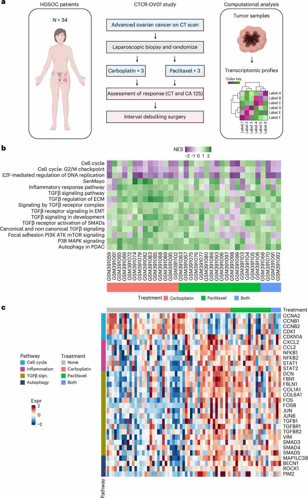 Figure 7. GSEA of microarray datasets from patients with ovarian cancer after chemotherapy treatment. (a) Schematic of the CTCR-OV01 study design. (b) Heatmap of normalized enrichment scores (NES) for 34 evaluable patients, showing enrichment in senescence and TGFβ pathways post-treatment. (c) Heatmap of gene expression z-scores for selected signaling pathway genes, stratified by pre- vs. post-treatment status and demonstrating consistent upregulation of TGFβ and mTOR signatures after platinum-based chemotherapy.