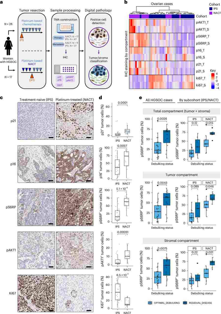 Figure 8. Senescence induction in patients with HGSOC after neoadjuvant treatment with platinum-based chemotherapy. (a) Study design schematic for HGSOC TMA cohort. (b) IHC staining heatmap by marker and region (S = stroma, T = tumor). (c) Representative IHC images of p21, p16, pS6RP, pAKT1, and Ki67 for IPS and NACT cohorts. (d) Quantification of IHC-positive cells in tumor regions. (e) pS6RP positivity stratified by surgical debulking outcome (optimal vs. residual disease) in IPS and NACT subgroups.