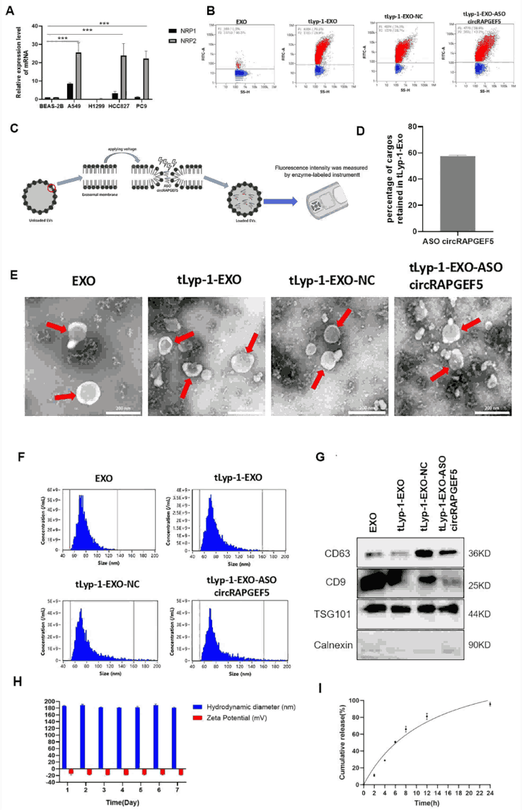 Figure 1. Construction and characterization of tLyp-1-EXO-circRAPGEF5 ASO. (A) NRP1/NRP2 overexpression in LUAD cells (A549, HCC827, etc.) verified by Western blot. (B) Nanoscale flow cytometry confirming tLyp-1 peptide conjugation on exosome surface. (C-D) Cy3-labeled circRAPGEF5 ASO successfully loaded, ~60% loading efficiency. (E) TEM showing intact bilayer cup-shaped morphology post-modification. (F) NTA showing size distribution of 52–160 nm with no significant change after modification. (G) Western blot confirming CD63/CD9/TSG101 expression and absence of Calnexin. (H) Stable particle size (181–189.1 nm) in PBS over 7 days. (I) ~95% ASO release within 24 hours, confirming delivery potential.