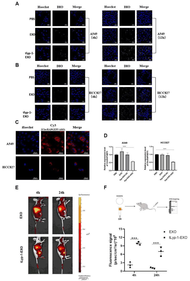 Figure 2. In vitro and in vivo targeting efficiency and ASO delivery. (A-B) Confocal microscopy showing enhanced uptake of DiO-labeled tLyp-1-EXO by A549/HCC827 cells, peaking at 12 h. (C) Intracellular delivery of Cy3-labeled ASO confirmed by confocal imaging. (D) RT-qPCR showing circRAPGEF5 downregulation following tLyp-1-EXO-ASO treatment. (E-F) IVIS imaging showing superior tumor accumulation and retention of DiR-labeled tLyp-1-EXO versus unmodified exosomes after tail vein injection.