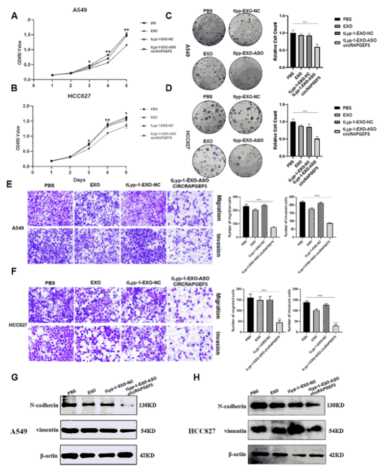 The functional impact of tLyp-1-EXO-circRAPGEF5 ASO on LUAD cells was systematically evaluated across multiple oncogenic behaviors. CCK-8 proliferation assays showed significant inhibition of A549 and HCC827 cell growth compared to controls. Colony formation assays confirmed a marked reduction in clonogenic capacity. Transwell migration and invasion assays demonstrated substantially decreased motility and invasiveness, while Western blot analysis revealed coordinated downregulation of EMT markers N-cadherin and Vimentin—proteins associated with mesenchymal transition and metastatic potential. Collectively, these results establish that tLyp-1-EXO-circRAPGEF5 ASO effectively inhibits proliferation, migration, invasion, and EMT in LUAD cells.
