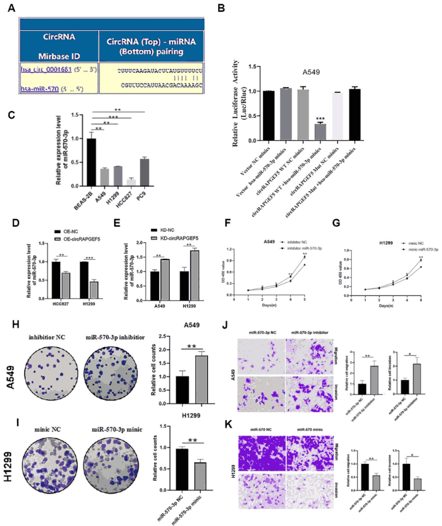 Figure 4. CircRAPGEF5 sponges miR-570-3p in LUAD. (A) Bioinformatic prediction of circRAPGEF5–miR-570-3p binding site. (B) Dual-luciferase reporter assay confirming direct binding. (C) Lower miR-570-3p expression in LUAD versus normal cells. (D-E) CircRAPGEF5 overexpression downregulates and knockdown upregulates miR-570-3p. (F-K) miR-570-3p mimics suppress, and inhibitors promote, LUAD cell proliferation, migration, and invasion.
