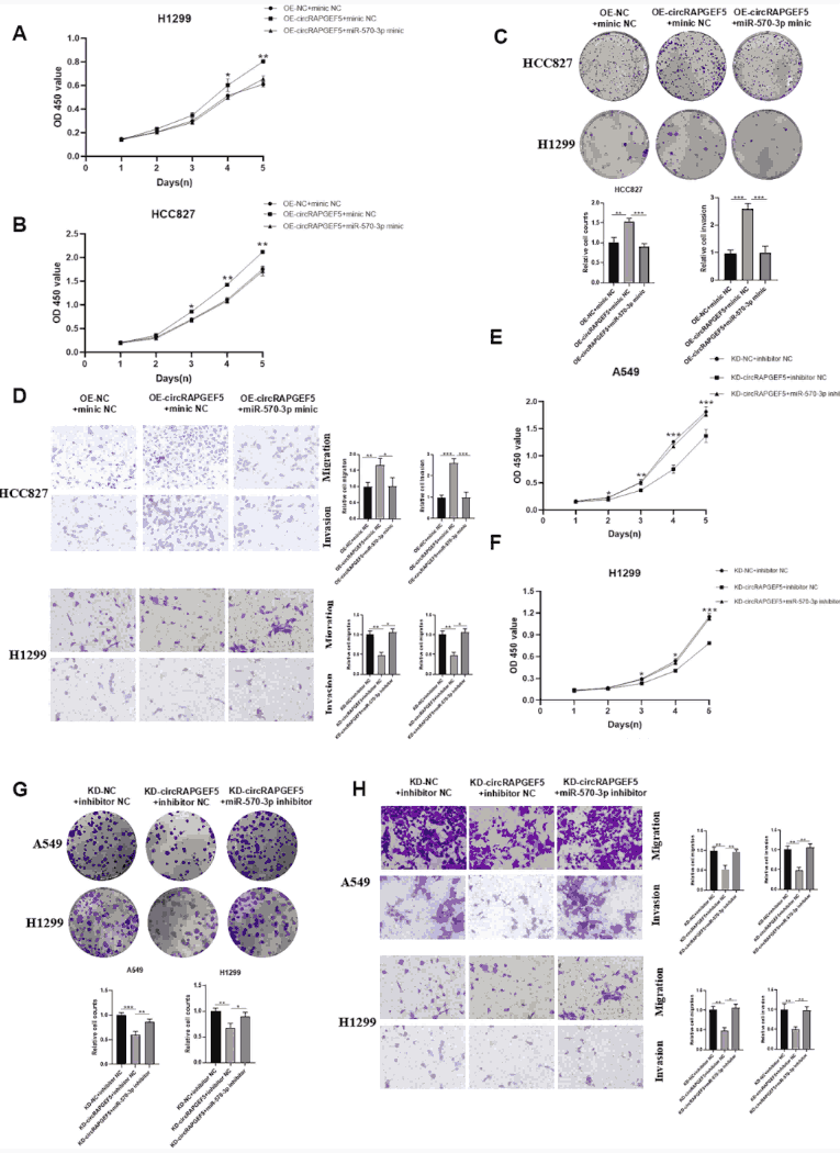 Figure 5. Rescue experiments confirming ceRNA mechanism. (A-D) miR-570-3p mimics reverse the pro-tumorigenic effects of circRAPGEF5 overexpression. (E-H) miR-570-3p inhibitors reverse the tumor-suppressive effects of circRAPGEF5 knockdown, confirming that circRAPGEF5 drives LUAD progression by sequestering miR-570-3p.