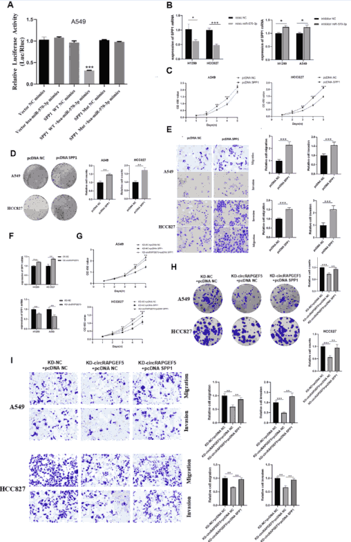 Figure 6. miR-570-3p directly targets SPP1. (A) Dual-luciferase reporter confirming miR-570-3p binding to SPP1 3'UTR. (B) miR-570-3p mimics downregulate and inhibitors upregulate SPP1. (C-E) SPP1 overexpression promotes LUAD proliferation, colony formation, migration, and invasion. (F) CircRAPGEF5 regulates SPP1 expression. (G-I) SPP1 overexpression reverses the tumor-suppressive effects of circRAPGEF5 knockdown.
