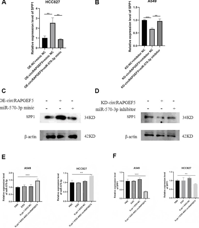 Figure 7. Pathway integrity validation. (A-C) miR-570-3p mimics reverse circRAPGEF5-overexpression-induced SPP1 upregulation. (B-D) miR-570-3p inhibitors reverse circRAPGEF5-knockdown-induced SPP1 downregulation. (E-F) tLyp-1-EXO-circRAPGEF5 ASO treatment upregulates miR-570-3p and downregulates SPP1 in LUAD cells, confirming on-target pathway modulation.