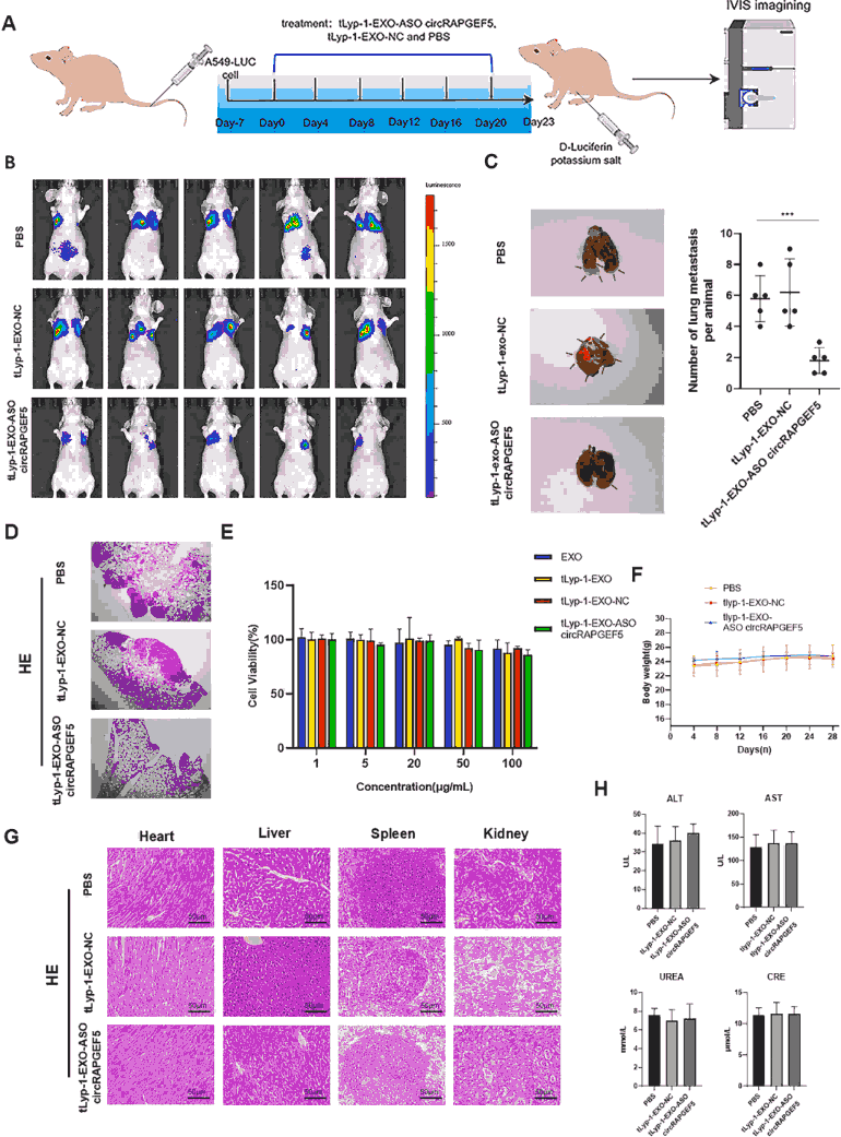 Figure 8. In vivo anti-tumor efficacy and biosafety. (A) Animal experimental design schematic. (B) IVIS imaging showing reduced tumor bioluminescence in tLyp-1-EXO-circRAPGEF5 ASO group. (C-D) Reduced lung metastatic nodule count and attenuated lung tissue injury. (E) CCK-8 showing no significant cytotoxicity in BEAS-2B normal cells. (F) Stable body weight across all groups. (G) H&E staining showing no pathological damage in heart, liver, spleen, and kidney. (H) Normal serum ALT/AST/UREA/CRE levels confirming systemic biosafety.