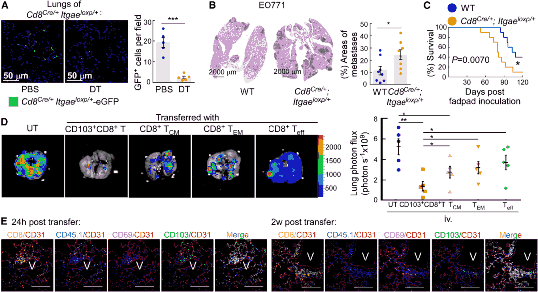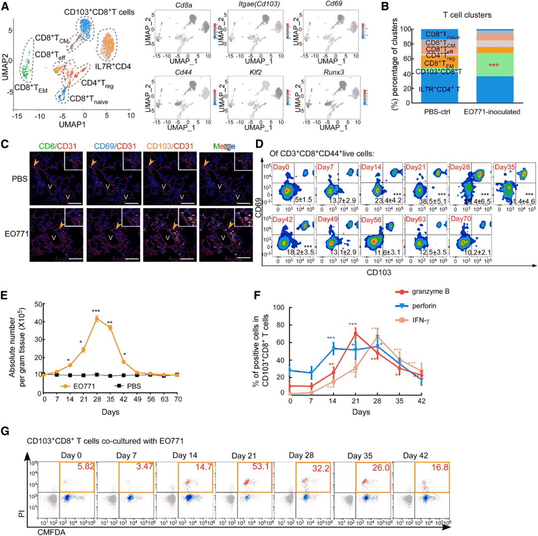 In EO771 breast cancer mouse models, CD103+CD8+T cells began accumulating in lung tissue at 2 weeks post-tumor inoculation, reaching peak levels at 21-28 days (representing 51.2% of CD8+T cells), followed by a sharp decline prior to macroscopic metastasis appearance. These cells were predominantly located within lung tissue rather than blood vessels in metastasis-preceding lungs and exhibited enhanced proliferative capacity, cytokine secretion (granzyme B, perforin, IFN-γ), and cytotoxic activity. Consistent findings were obtained in 4T1 breast cancer and B16F10 melanoma models. In clinical samples, CD103+CD8+T cell infiltration was significantly higher in cancer-distant lung tissue (>10 cm from metastatic foci) compared to peritumoral and metastatic tissues in patients with lung metastasis.
