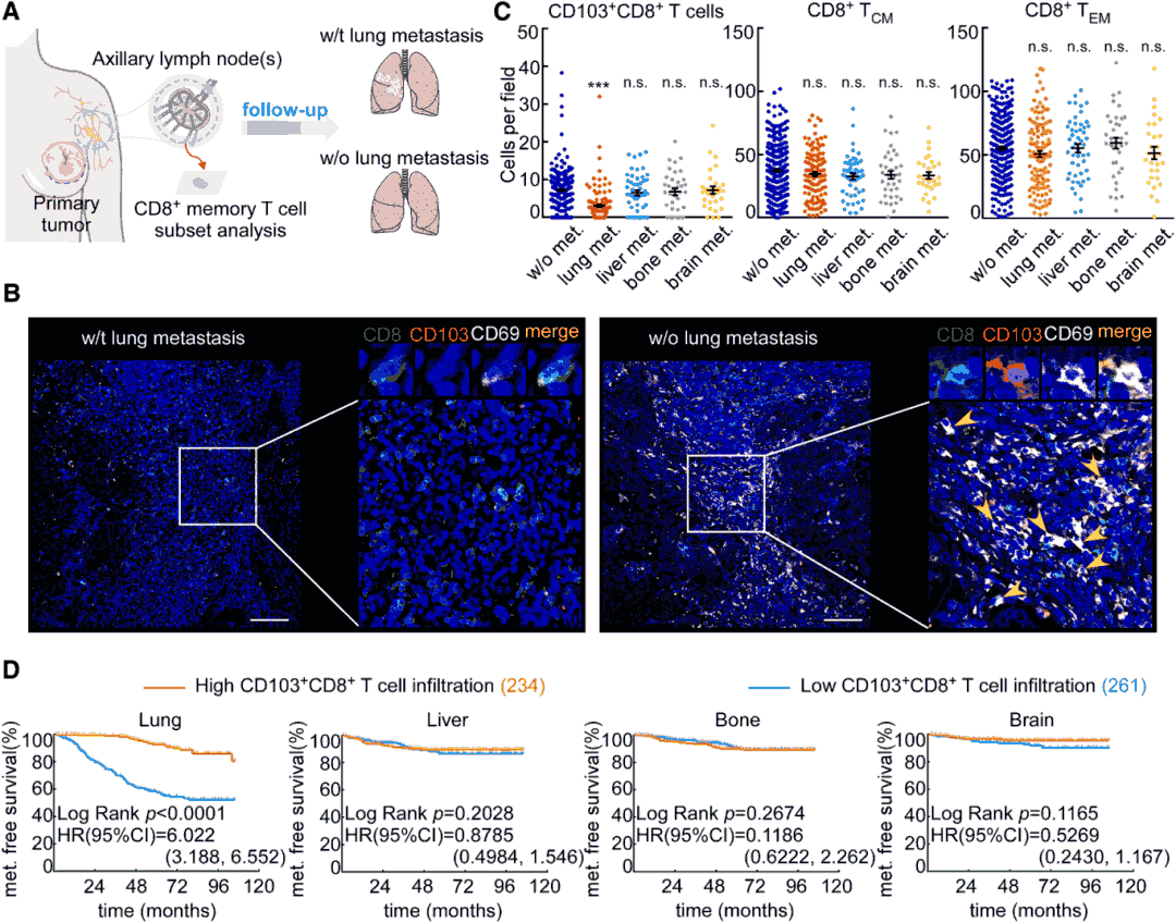Analysis of CD8+T cell subsets in TDLN of 533 breast cancer patients showed that the abundance of CD103+CD8+T cells (resident memory phenotype) was significantly correlated with reduced risk of lung metastasis, while CD8+ central memory T cells (TCM) and effector memory T cells (TEM) had no such correlation. Higher abundance of these cells was associated with longer lung-specific metastasis-free survival in patients, which was applicable to all breast cancer subtypes. The infiltration of these cells in metastatic lung tissue was negatively correlated with metastatic load.