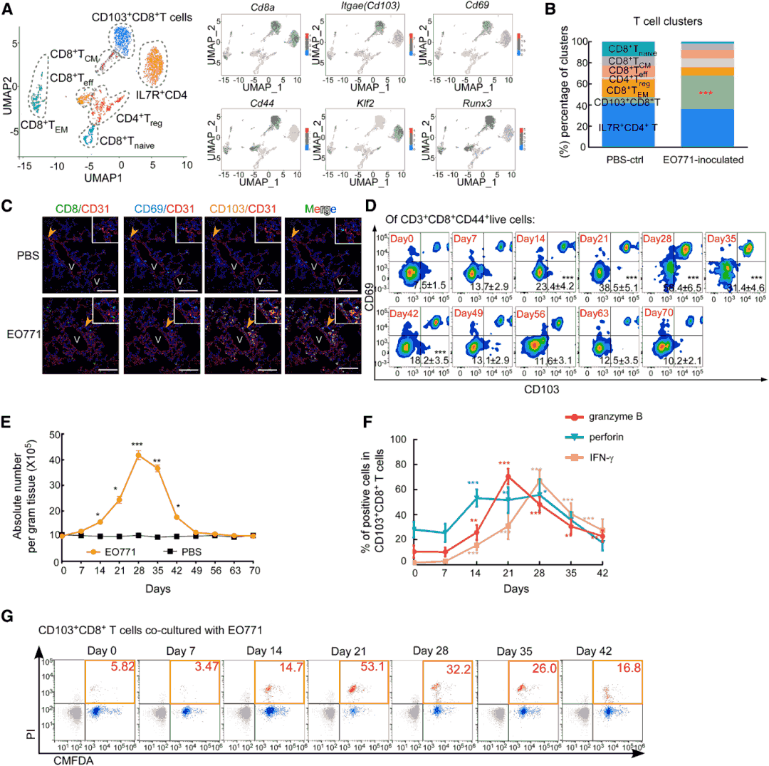 In the EO771 breast cancer mouse model, CD103+CD8+T cells began to accumulate in lung tissue 2 weeks after tumor inoculation, reached a peak (51.2% of CD8+T cells) at 21-28 days, and then decreased sharply before the appearance of macroscopic metastasis. These cells were mainly located in lung tissue rather than blood vessels in pre-metastatic lungs, and showed enhanced proliferation ability, cytokine secretion (granzyme B, perforin, IFN-γ) and tumor-killing activity. Consistent results were obtained in 4T1 breast cancer and B16F10 melanoma models. In clinical samples, the infiltration of CD103+CD8+T cells in distant non-tumor lung tissue (more than 10cm from metastatic lesions) of patients with lung metastasis was significantly higher than that in paracancerous and metastatic tissues.