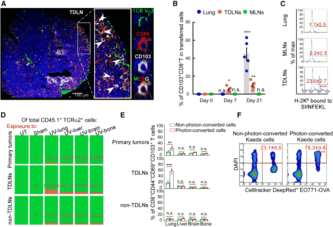 OT-I T cell tracking experiments showed that tumor-antigen-specific CD103+CD8+T cells first accumulated in TDLN (1 week after inoculation) and were detected in pre-metastatic lungs 3 weeks later. Kaede photo-conversion experiments confirmed that CD103+CD8+T cells infiltrating the lungs originated from TDLN rather than primary tumors or other lymph nodes. Dendritic cells (DC) in TDLN could effectively initiate CD103+CD8+T cells, and their initiating ability increased with the progression of metastasis. Inhibition of lymphocyte migration from TDLN using FTY720 significantly reduced the infiltration of CD103+CD8+T cells in the lungs, confirming that these cells need to circulate from TDLN to the lungs to function.