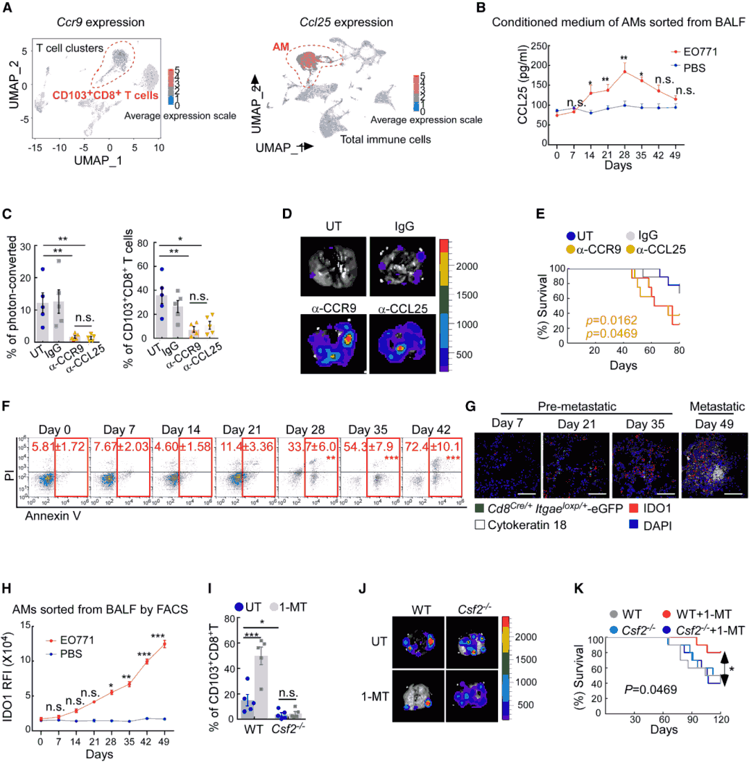 Fig5 AMs drive lung CD103+CD8+T cell deployment through CCL25/CCR9 and induce their death through IDO1