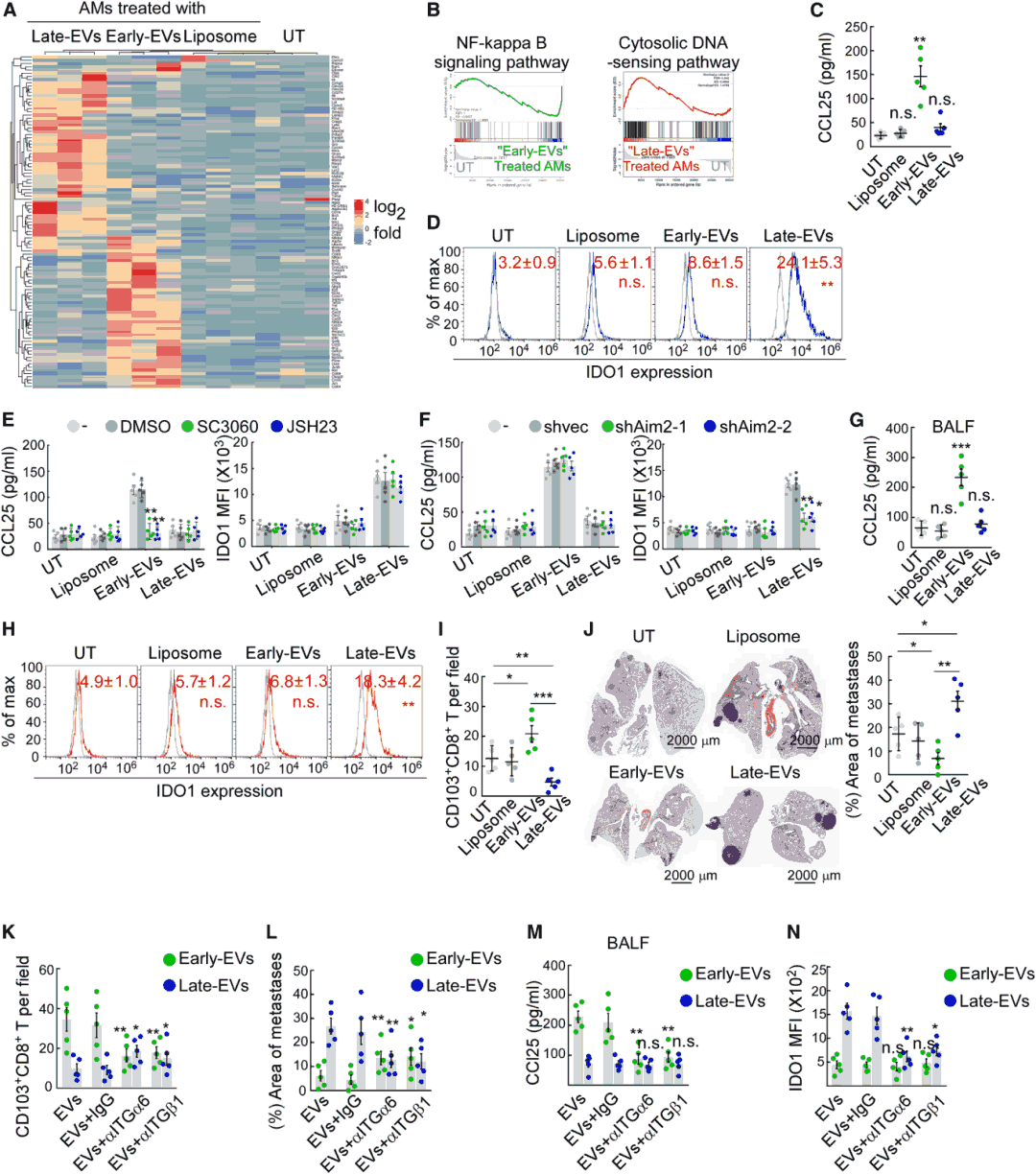 EVs released in the early and late stages of tumors (early-EV, late-EV) had no significant differences in morphology and diameter, but different cargo: early-EV were rich in proteins (such as TNF-α), while late-EV were rich in double-stranded DNA. Early-EV induced AMs to secrete CCL25 by activating the NF-κB pathway, and late-EV induced AMs to express IDO1 by activating the AIM2 pathway. In vivo experiments confirmed that injection of early-EV could increase the infiltration of CD103+CD8+T cells in the lungs and reduce metastasis, while late-EV had the opposite effect. This effect could be reversed by blocking ITGα6/ITGβ1 (lung-targeted uptake molecules) on the surface of EVs.