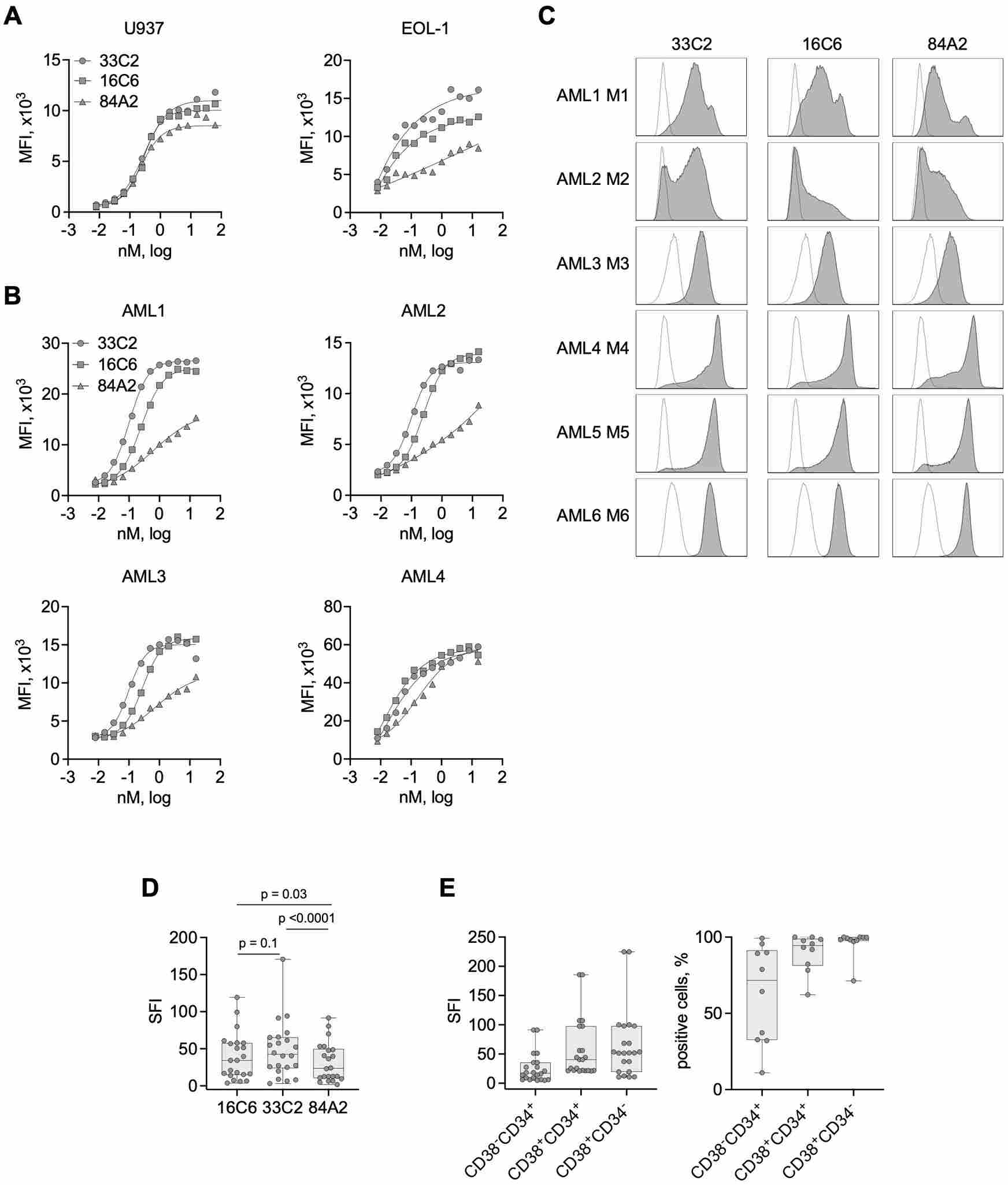 Figure 1. Expression and binding validation of the MIC12/MIC+ immunocytokine platform. CLEC12A/CD19/CD20 expression on leukemia cell lines (left panels) and flow cytometry confirmation of immunocytokine binding to target-antigen-positive cells (right panels). This antibody-engineering validation framework mirrors how NALM-6 Luc is used to confirm MIC+ specificity.
