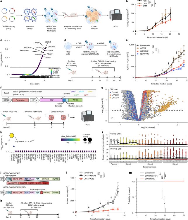 The research team employed a two-stage screening pipeline. First, they performed an unbiased in vivo CRISPR activation screen using the SAM (synergistic activation mediator) sgRNA library in HER2-CAR-NK92 cells, which were then infused into HT29 colon cancer-bearing immunodeficient mice. By sequencing sgRNAs from tumor-infiltrating NK cells versus input populations, they identified genes whose activation conferred a selective advantage for NK cell persistence and expansion within tumors. Among the top hits, OR7A10, SGSM2, and APLN showed the strongest enrichment signals.