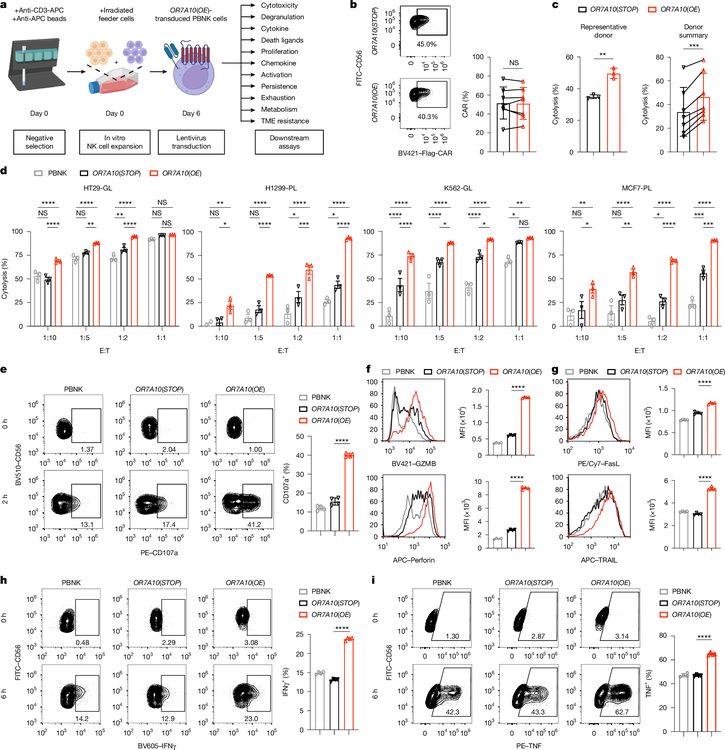 The team validated OR7A10's effects using primary human NK cells isolated from seven independent healthy donors, transducing them with lentiviral vectors co-expressing OR7A10 and a mesothelin-targeting CAR construct. Across all donors, OR7A10-expressing CAR-NK cells exhibited markedly enhanced cytotoxicity against HT29 colon carcinoma cells compared to control CAR-NK cells. This enhancement was consistent across multiple effector-to-target ratios and extended to diverse target cell lines including H1299 lung carcinoma, MCF7 breast adenocarcinoma, and K562 leukemia cells, indicating broad applicability.