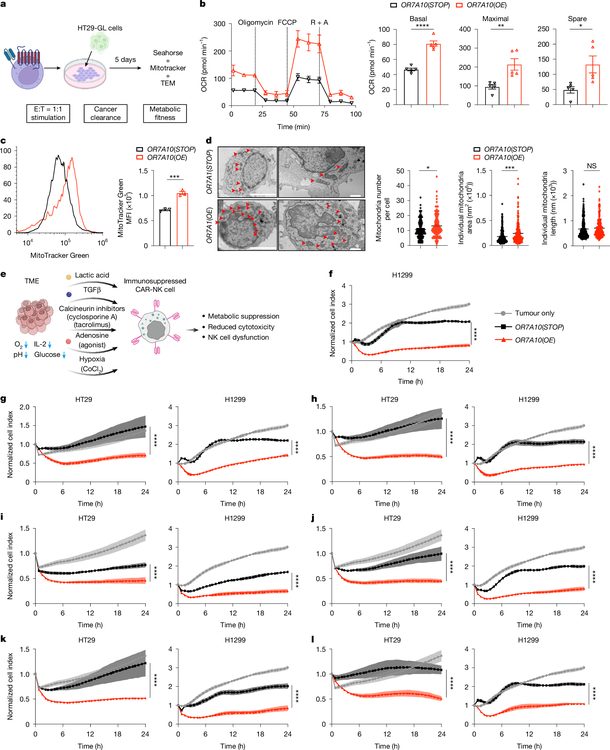 One of the most remarkable aspects of OR7A10 engineering is its ability to confer metabolic resilience. Seahorse extracellular flux analysis revealed that OR7A10-overexpressing CAR-NK cells exhibit elevated basal oxygen consumption rate, maximal respiratory capacity, and spare respiratory capacity compared to controls. Mitochondrial staining and electron microscopy confirmed increased mitochondrial mass with enlarged individual mitochondria, indicating enhanced mitochondrial biogenesis rather than fusion-mediated remodeling.